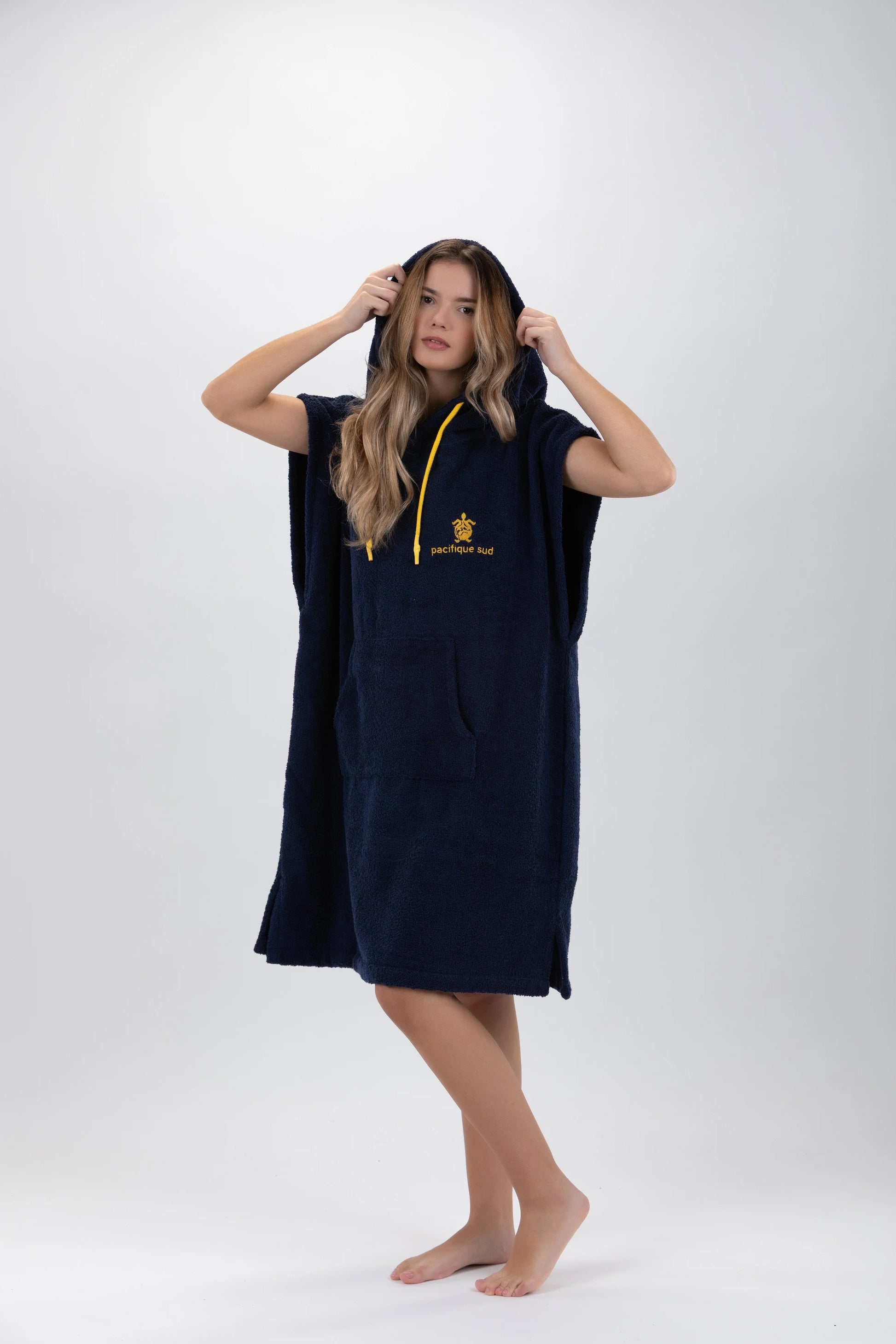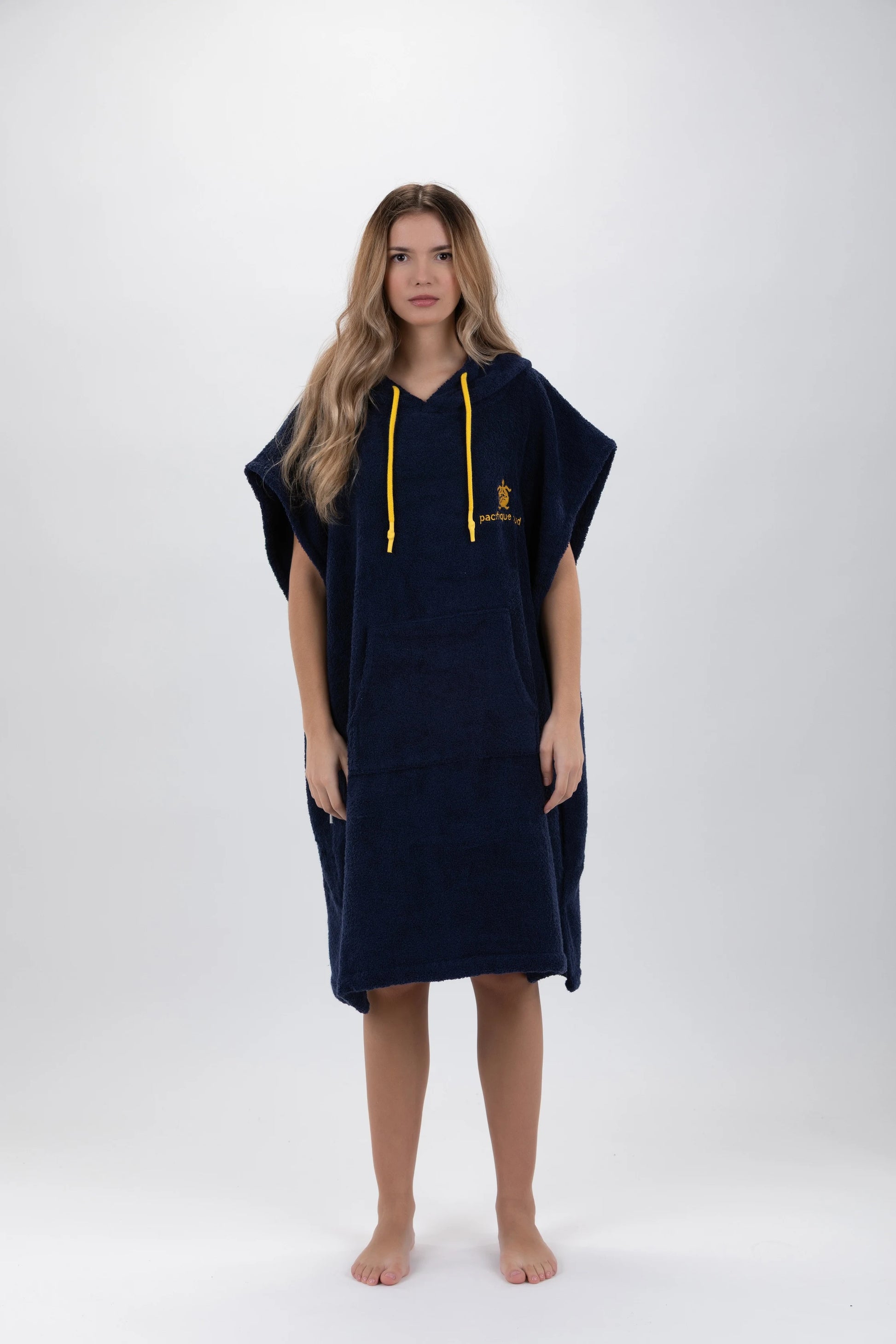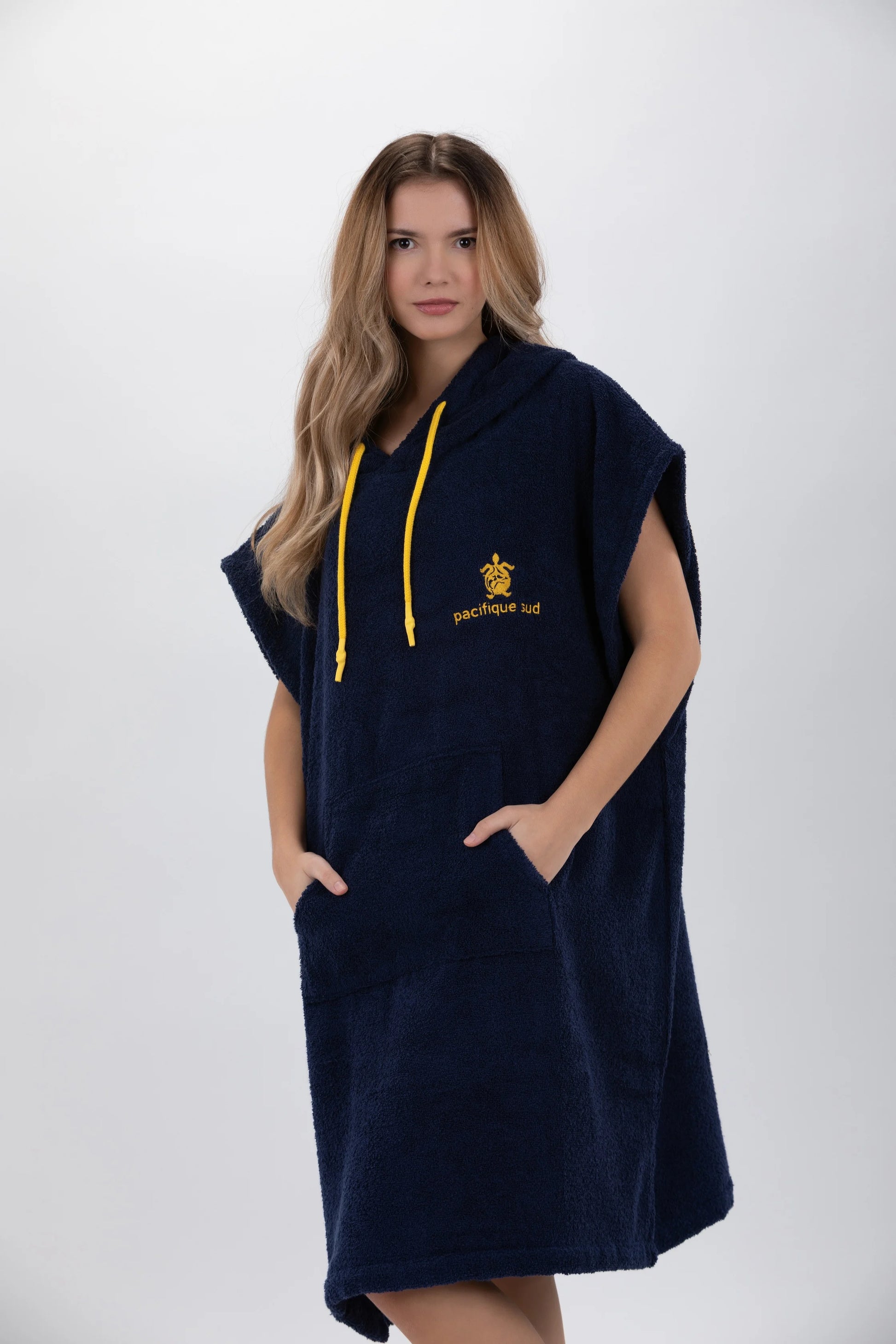 Dieser dunkelblaue Poncho von Pacifique Sud ist mal eine andere Art von „Bademantel“. Ich hatte ihn mit zum Strand. Er ist nicht nur zum Umziehen super geeignet, auch zum Chillen nach dem Baden ist er toll. Der einlagige Frottee ist dicht und kuschelig. Der Schnitt ist lässig und bequem. Mir gefällt besonders die große Kapuze - die mittels Zugband enger geschnürt werden kann. Und die Känguru-Tasche am Bauch ist einfach praktisch. Vor dem ersten Tragen habe ich den Poncho gewaschen, danach hat der Frottee nicht mehr gefusselt. Sowohl die Waschmaschine, als auch den Wäschetrockner hat der Poncho überstanden, ohne einzulaufen. Und der Frottee wird nach dem Trocknen im Wäschetrockner besonders weich und kuschelig.Zur Größe hat der Hersteller den Hinweis gegeben, dass der Poncho bei Personen mit einer Größe von +/- 1,75 cm und einem Gewicht von +/- 75 kg optimal sitzt. Das finde ich realistisch. Bei größeren Personen fällt der Poncho sonst recht kurz aus.Fazit:Der Bade-Pocho ist praktisch, bequem und sieht lässig aus - ich bin sehr zufrieden 👌🏻