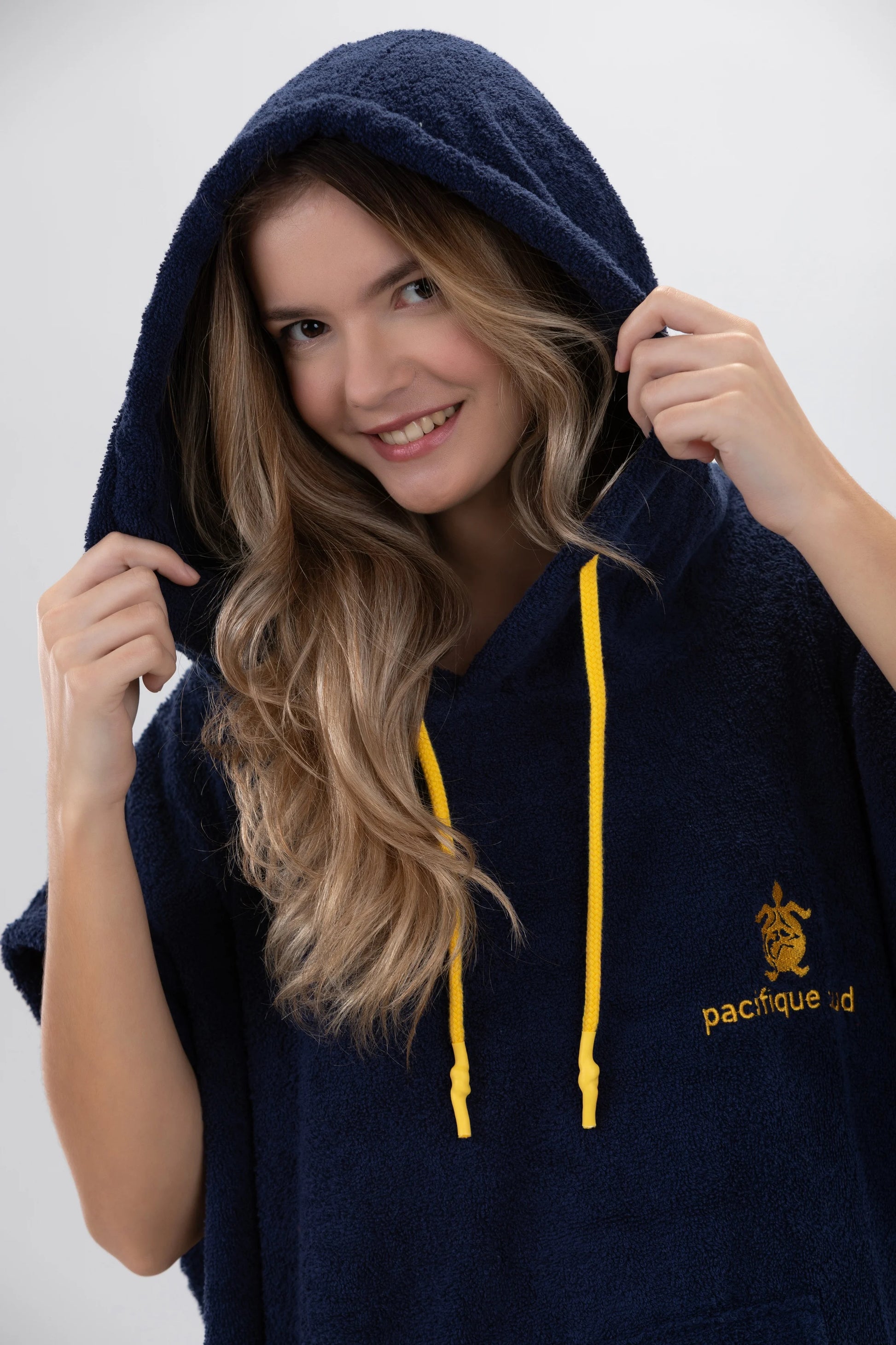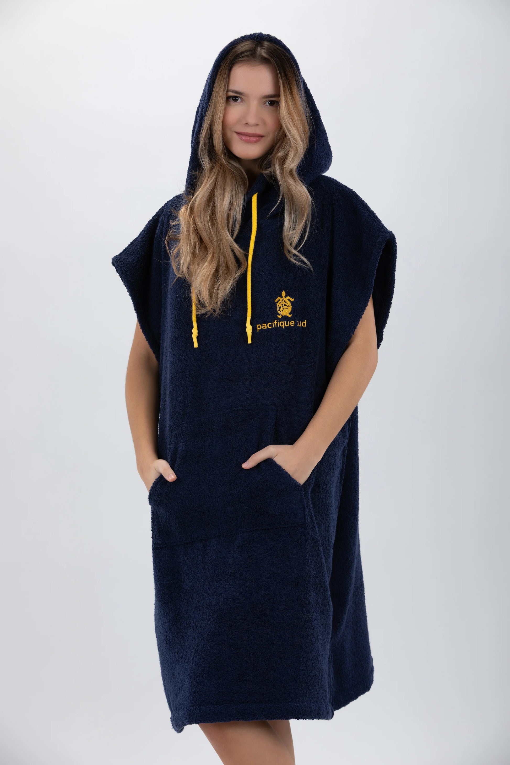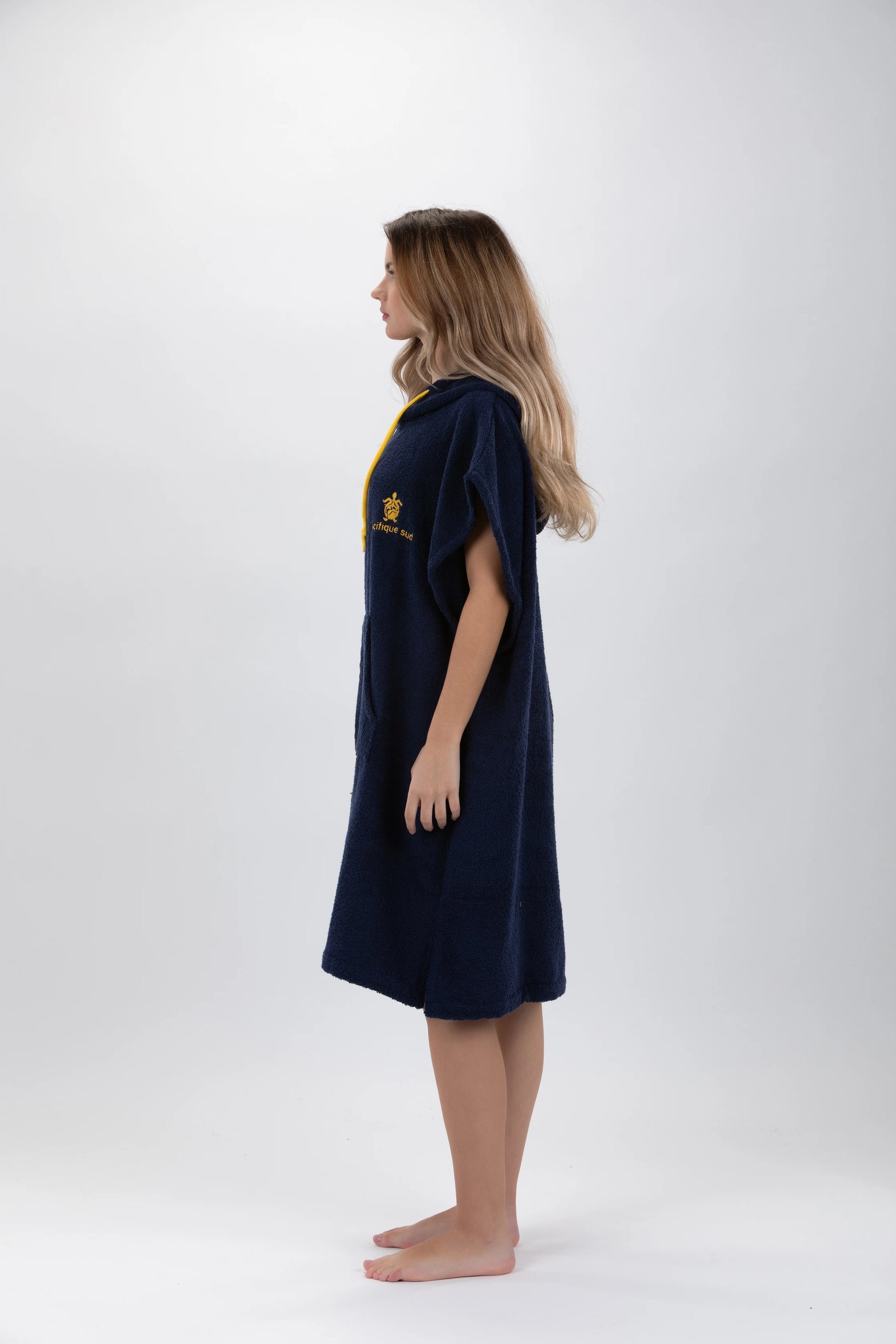 Dieser dunkelblaue Poncho von Pacifique Sud ist mal eine andere Art von „Bademantel“. Ich hatte ihn mit zum Strand. Er ist nicht nur zum Umziehen super geeignet, auch zum Chillen nach dem Baden ist er toll. Der einlagige Frottee ist dicht und kuschelig. Der Schnitt ist lässig und bequem. Mir gefällt besonders die große Kapuze - die mittels Zugband enger geschnürt werden kann. Und die Känguru-Tasche am Bauch ist einfach praktisch. Vor dem ersten Tragen habe ich den Poncho gewaschen, danach hat der Frottee nicht mehr gefusselt. Sowohl die Waschmaschine, als auch den Wäschetrockner hat der Poncho überstanden, ohne einzulaufen. Und der Frottee wird nach dem Trocknen im Wäschetrockner besonders weich und kuschelig.Zur Größe hat der Hersteller den Hinweis gegeben, dass der Poncho bei Personen mit einer Größe von +/- 1,75 cm und einem Gewicht von +/- 75 kg optimal sitzt. Das finde ich realistisch. Bei größeren Personen fällt der Poncho sonst recht kurz aus.Fazit:Der Bade-Pocho ist praktisch, bequem und sieht lässig aus - ich bin sehr zufrieden 👌🏻